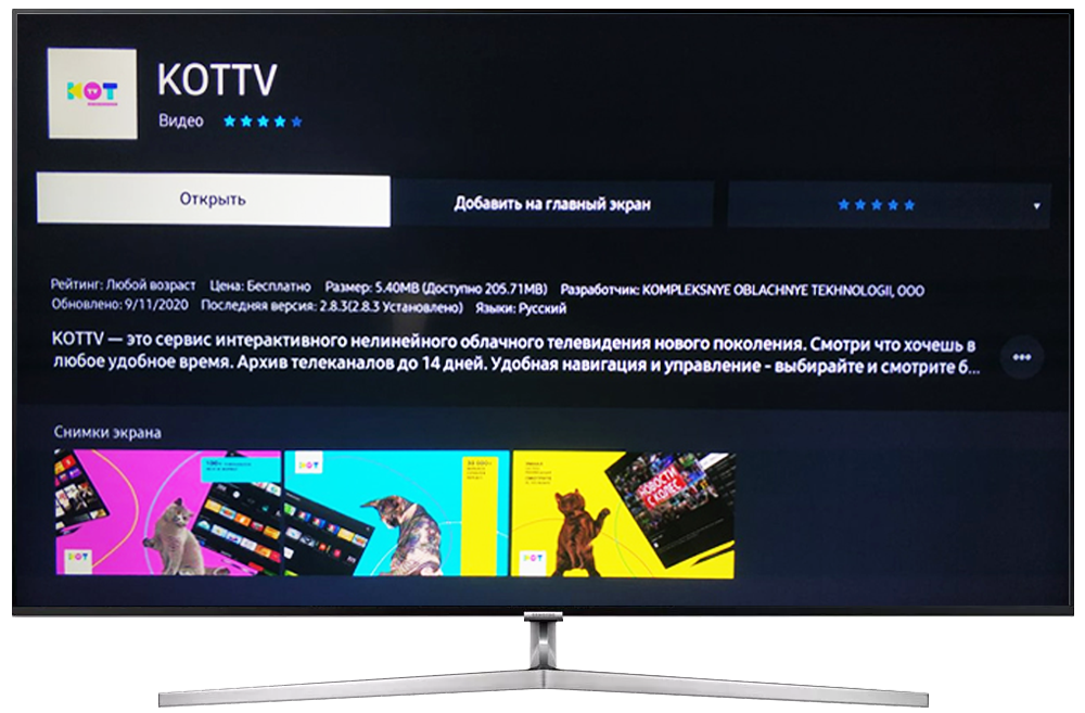 Далее зайдите в магазин приложений вашего Smart TV, пользуясь поиском, найдите приложение KOTTV и установите его на ваш телевизор: